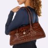 This satchel started with inspiration from a vintage Brahmin bag. We added fresh, modern twists and functional details like the turn lock closure, a back slide in pocket, and rolled handles. The bottom feet offer protection and ease.