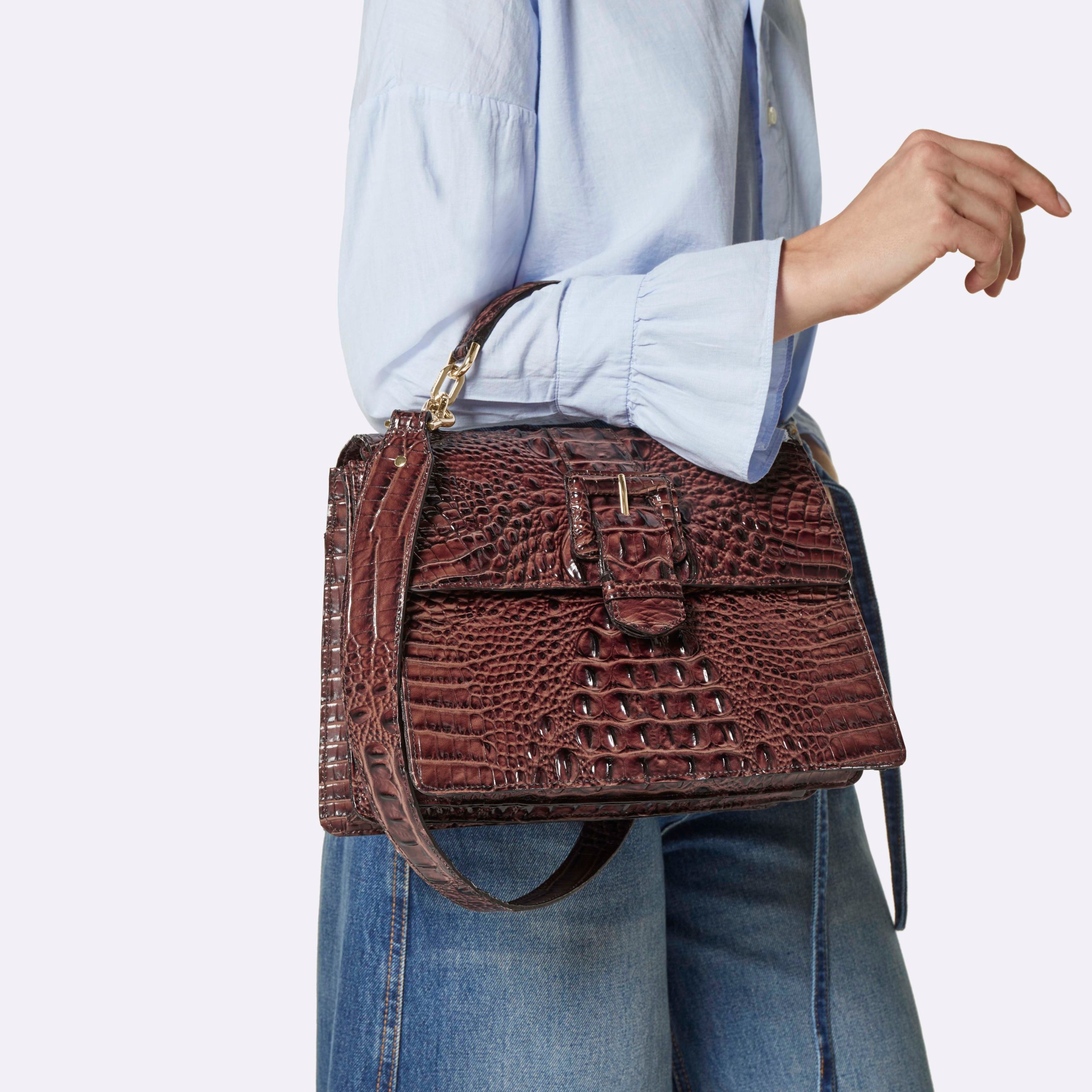 Featured in Sandstorm Yuma, a pinnacle of artistry and craftmanship. Exotic textured leathers get brought to life with colorful custom embroidery. Our luxurious flat croc in a warm chestnut accents our softer approach to classic Melbourne, Sandstorm Alden Road. Applique embroidery depicts a snake twining through flowers and foliage as a nod to classic Americana. Made with genuine leather.