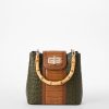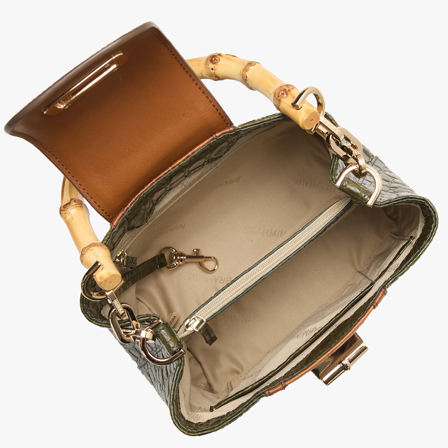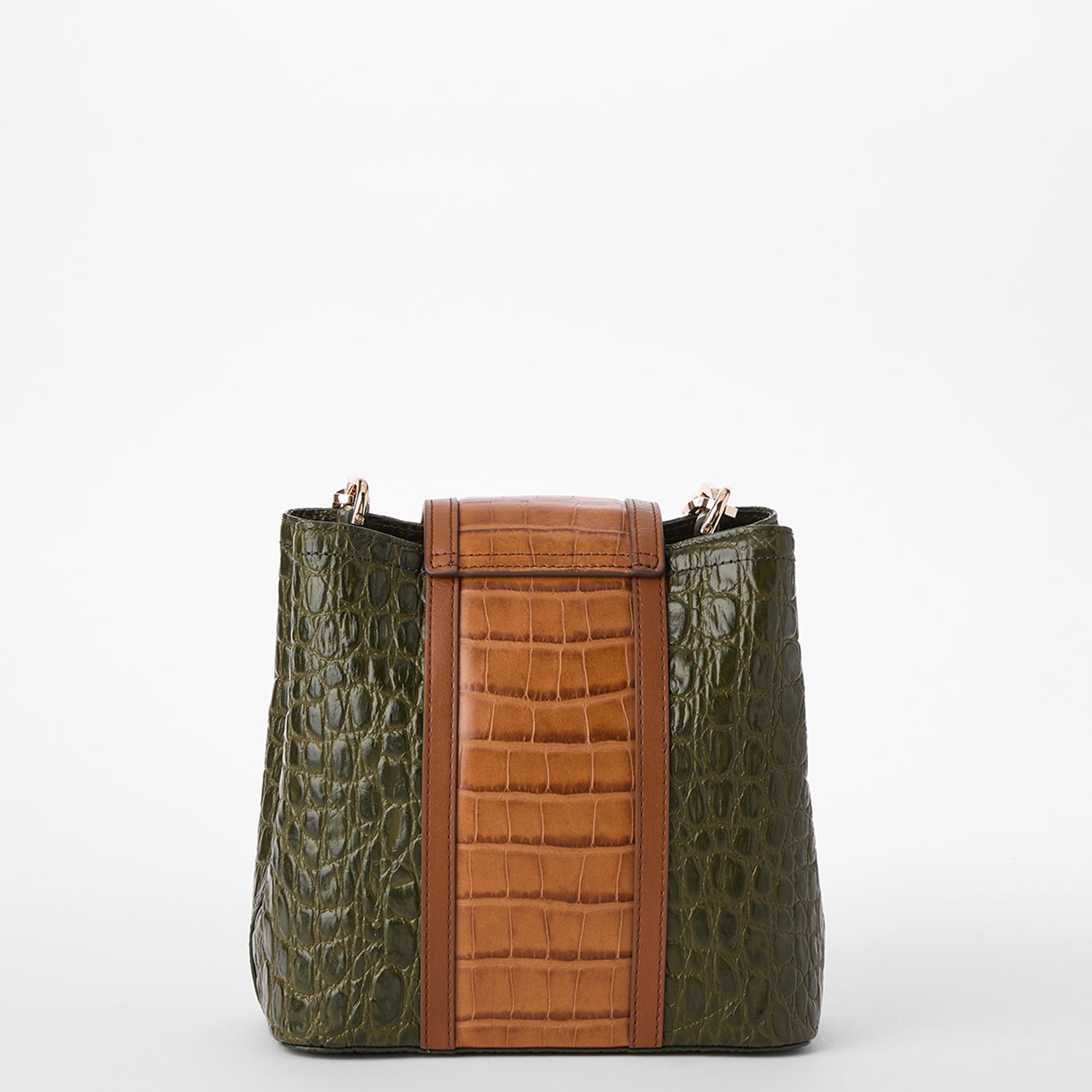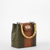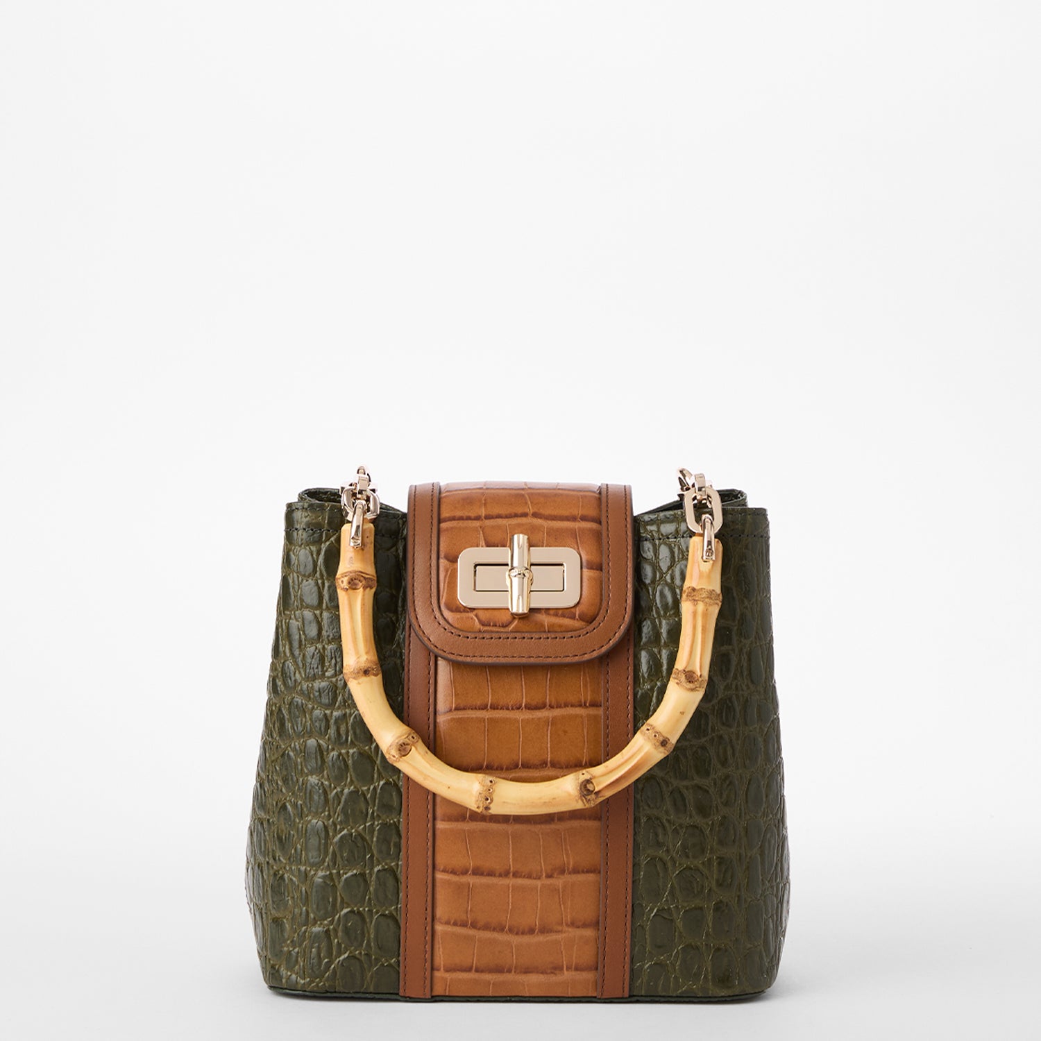 Featured in Green Brookhaven, an ultra-luxe combination of textures. This pairs together nature-inspired neutrals in elevated textures that bring dimension. The rich forest green rounded croc-embossed leather plays well with the warm tan flat croc and smooth leather trim. Select styles feature custom metal bamboo turn-lock hardware and a novelty bamboo handle. Made with genuine leather.