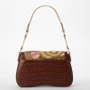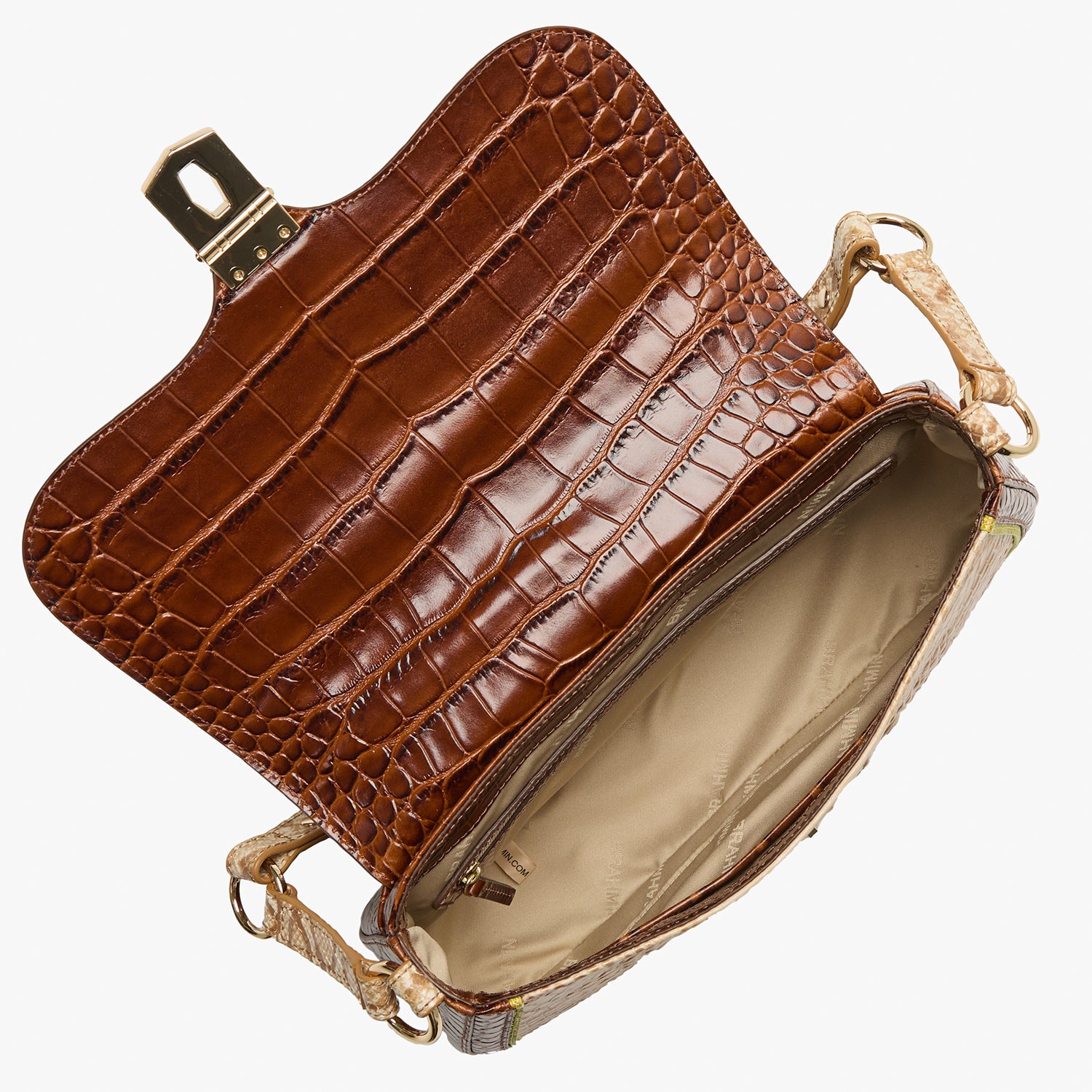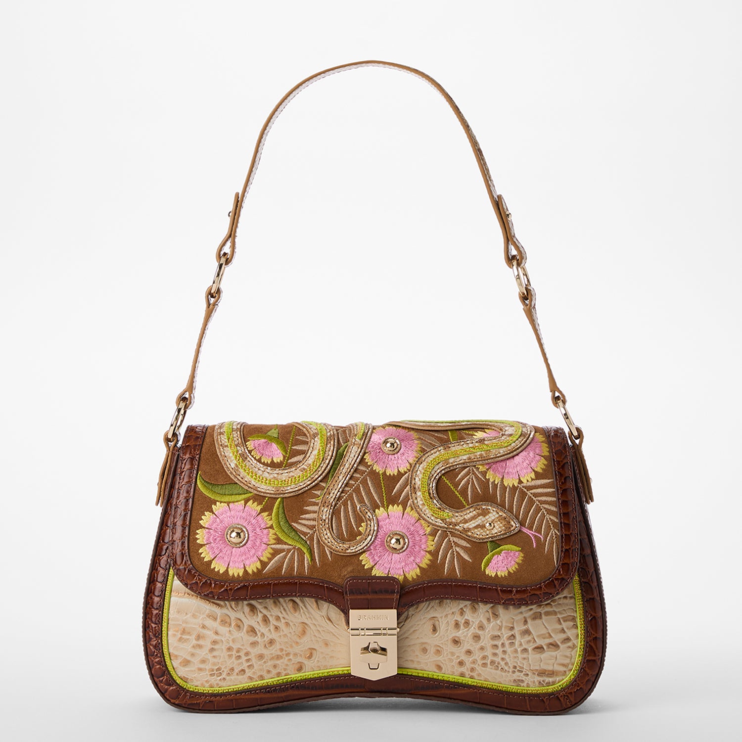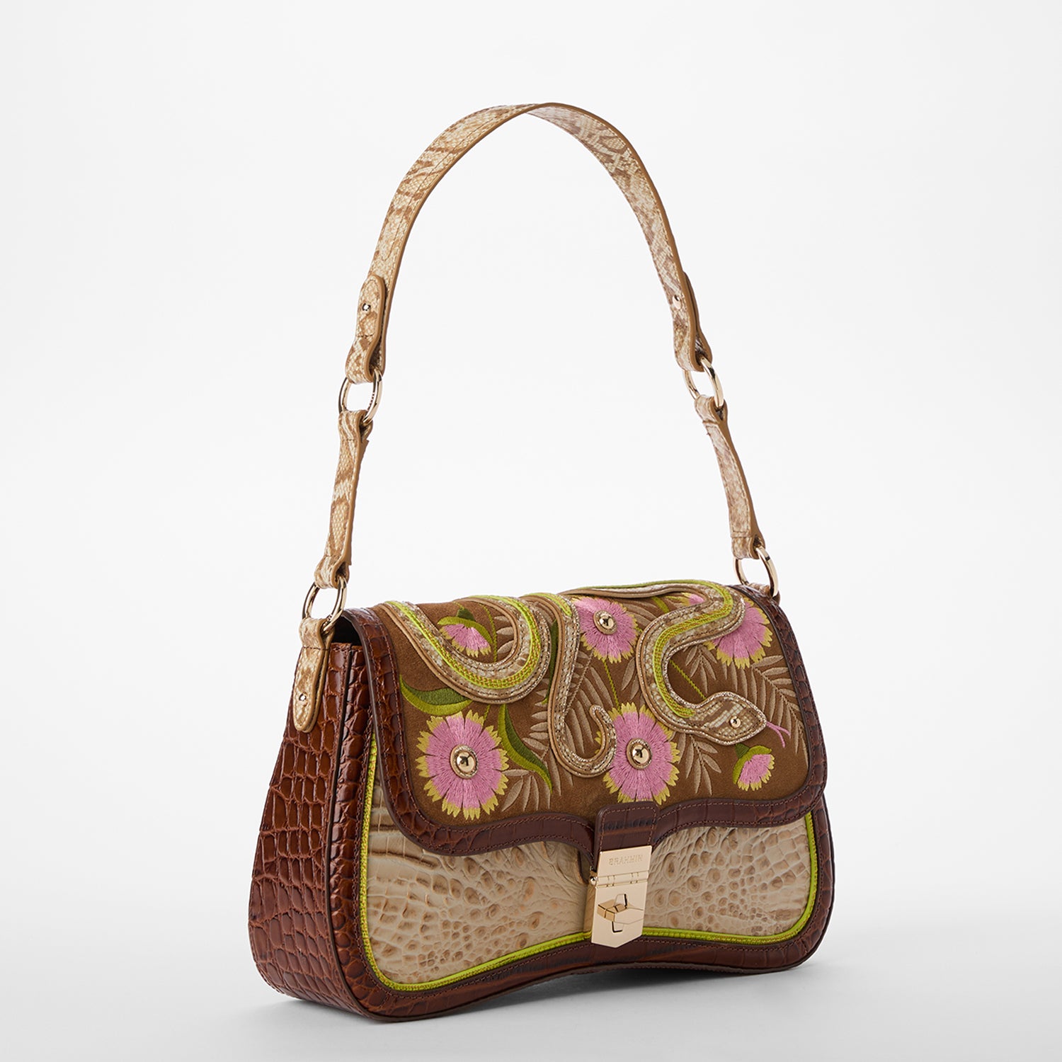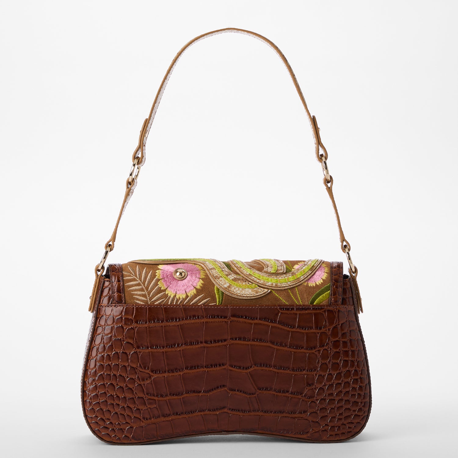 Featured in Sandstorm Yuma, a pinnacle of artistry and craftmanship. Exotic textured leathers get brought to life with colorful custom embroidery. Our luxurious flat croc in a warm chestnut accents our softer approach to classic Melbourne, Sandstorm Alden Road. Applique embroidery depicts a snake twining through flowers and foliage as a nod to classic Americana. Made with genuine leather.