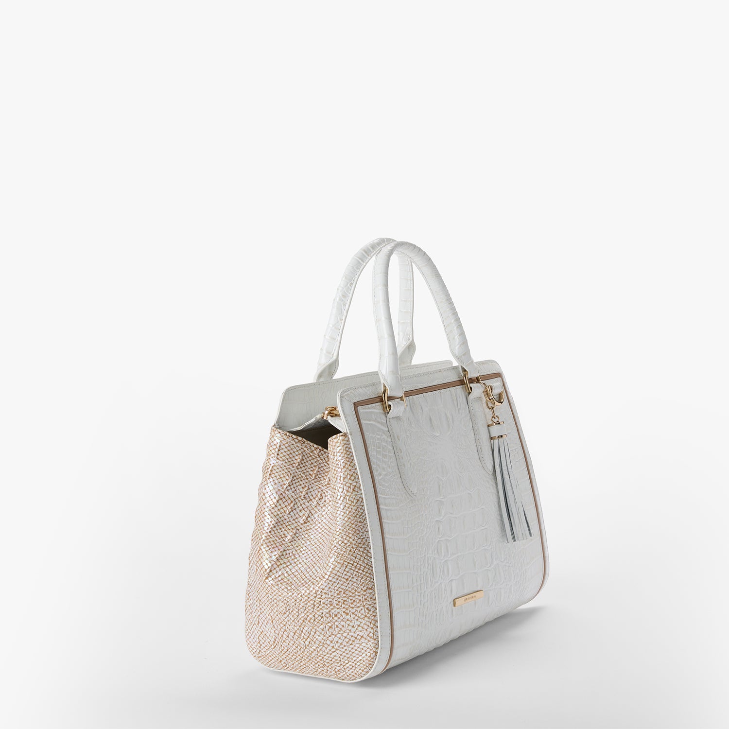 Featured in Sea Salt White Colada, a multi-Melbourne that combines some of our favorite neutrals in our iconic Melbourne leather. This brings together Sea Salt with a touch of iridescence in Tiramisu for a fresh twist on spring neutrals. The matching smooth trim gives this added dimension. Select styles feature an inlay leather buckle and a playful fixed tassel. Made with genuine leather.