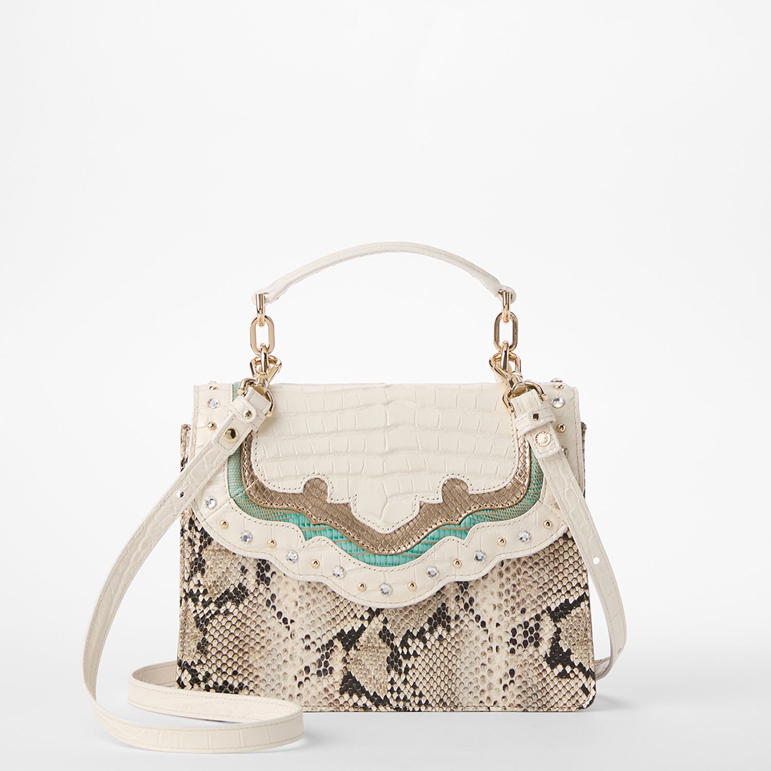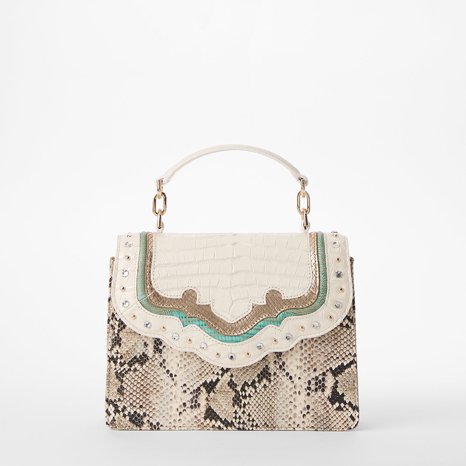 Featured in Cloud Dancer Dubois, a fresh blend of texture and color. An Americana-inspired collection that brings together a white flat croc with neutral beige snake print, gold metallic, and a pop of turquoise lizard. The curved applique and cutouts are an elevated twist on Western. Stud and Swarovski® crystal accents give this luxe appeal. Made with genuine leather.