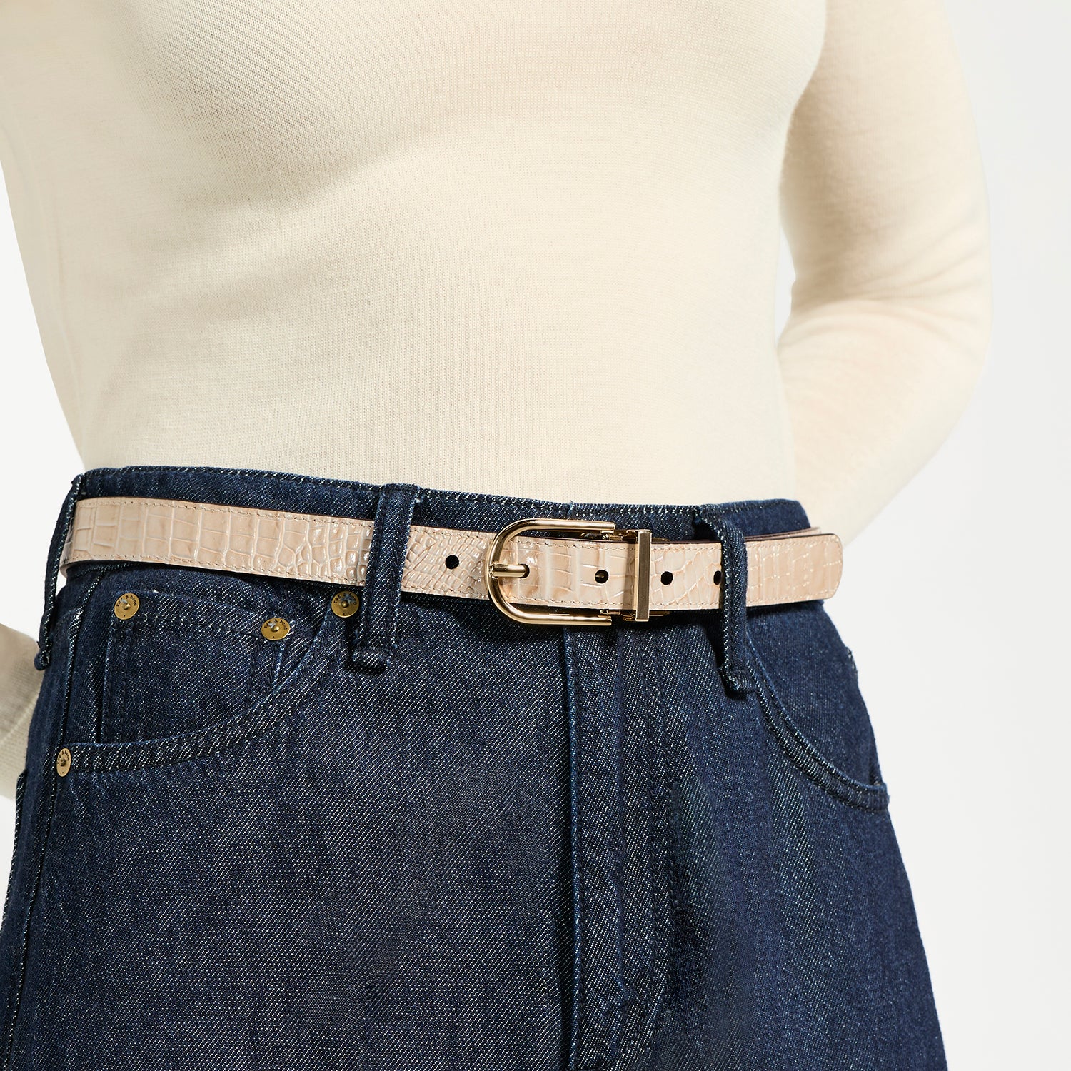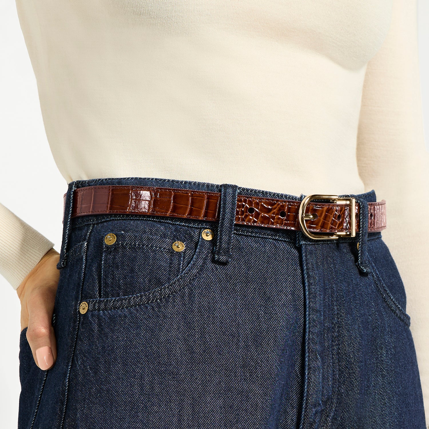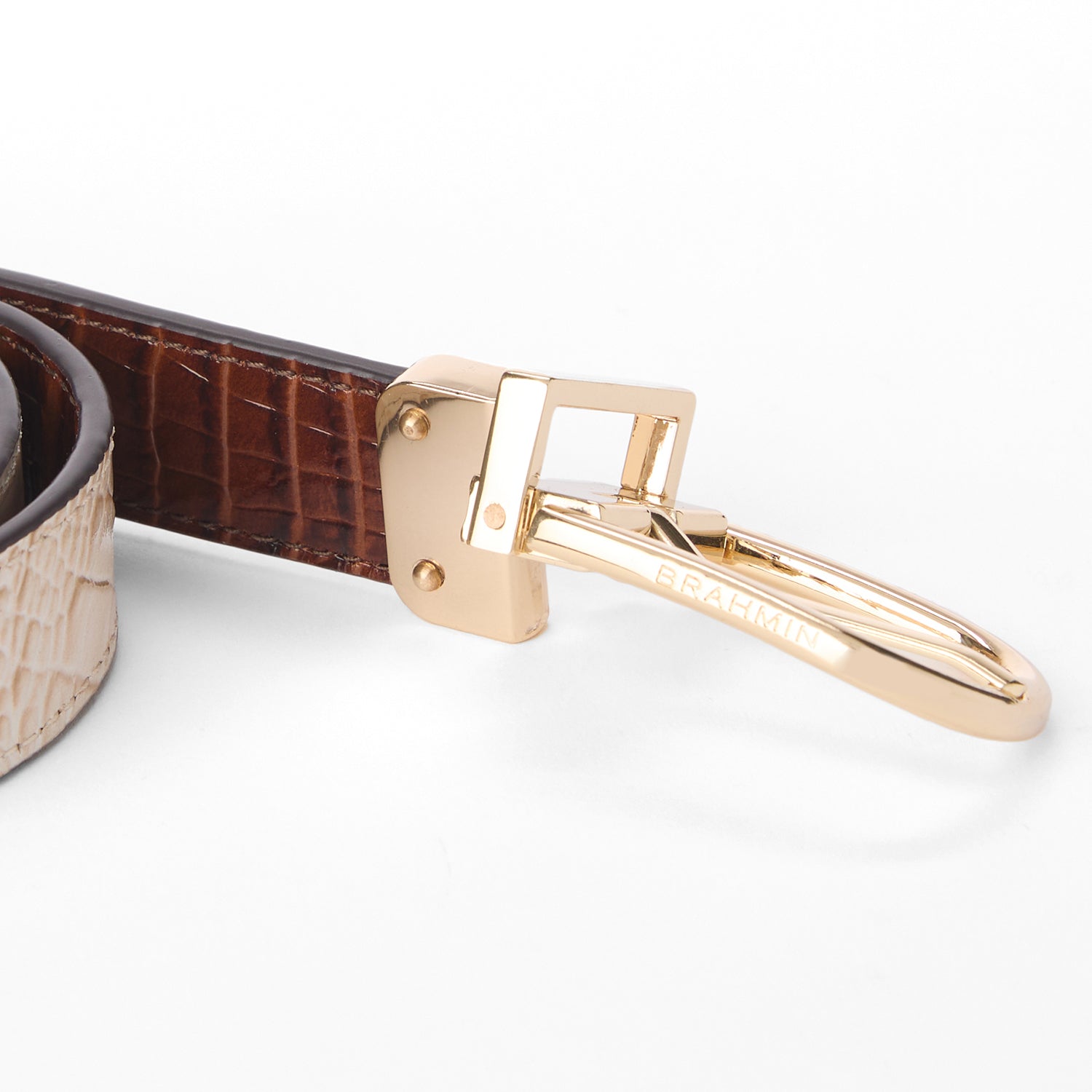 Featured in Contour Classic Croc Belt, a reversible accessory that gives you style flexibility. Two classics, one style. This belt features warm Chestnut Melbourne leather on one side and cool Contour on the reverse. The metal belt buckle easily rotates from one side to the other for a smooth transition. Brahmin branding is visible on both sides of the buckle for an added element of luxury. Made with genuine leather.